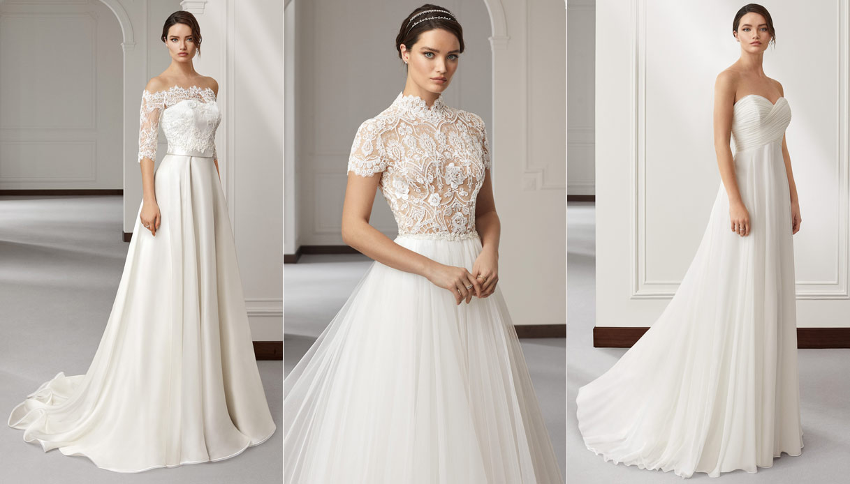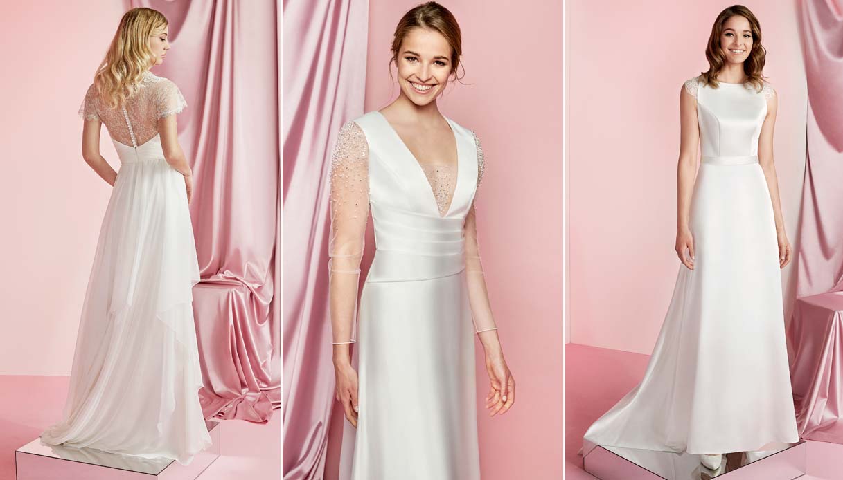 Vediamo nel dettaglio i modelli che Raffaella Fusetti ha scelto per noi. Martina è un raffinato abito con corpino in crêpe cady lucido, con un’eterea gonna a ruota in preziosa ed impalpabile organza soft di pura seta. Completa l’abito un’elegante cintura staccabile in cady con rosa d’ organza che evidenzia il punto vita. Abbinato qui con un cache coeur in pizzo. Petra è un elegante abito due pezzi, caratterizzato da body con preziosa veletta ricamata effetto “nude” e silhouette con raffinati dettagli bon-ton. Completa l’abito l’ampia gonna di vaporoso tulle con cinturina gioiello che evidenzia il punto vita. Infine Anya, un abito scivolato in chiffon con scollo a cuore drappeggiato incrociato davanti, che lascia la schiena scoperta.