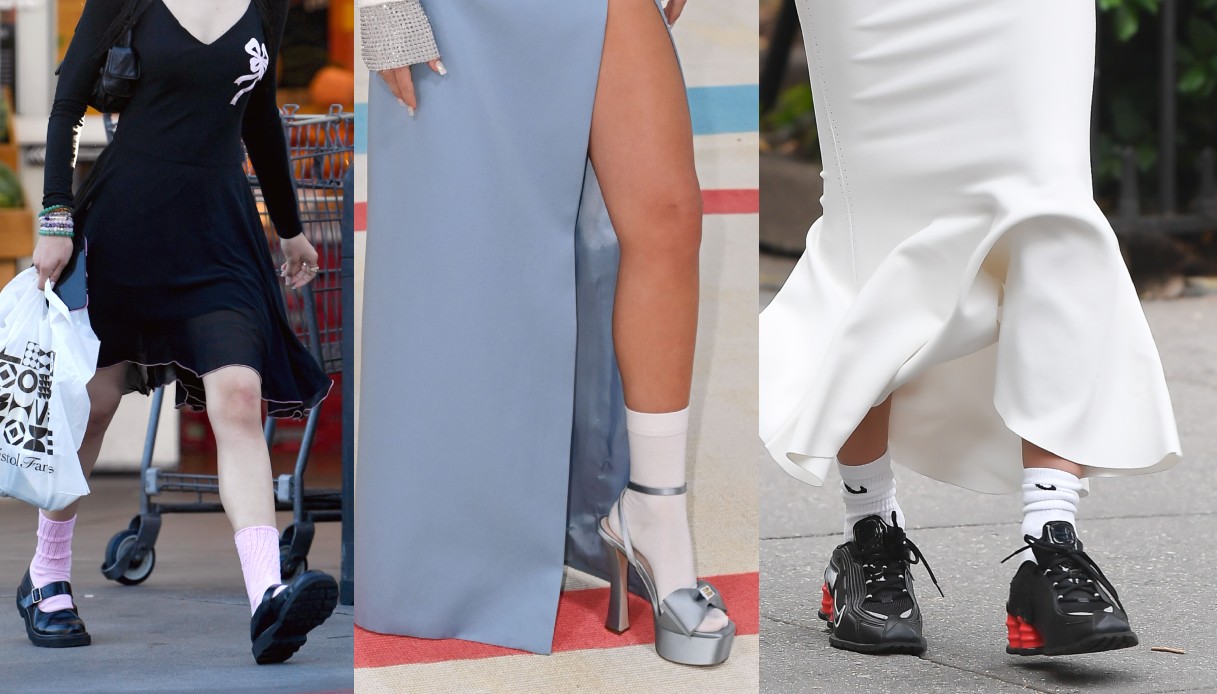 Infine, l’abbinamento più audace ma di sicuro successo: le scarpe con il tacco e i calzini. Se nella versione più semplice, perfetta per chi non vuole uscire dalla propria confort-zone, basta indossare delle normali décolleté e dei gambaletti alti al ginocchio, la scelta di Emma Chamberlain è decisamente più azzardata. La youtuber sfoggia infatti dei veri e propri trampoli con plateau, abbinandoli ad un paio di calzini bianchi a metà polpaccio.