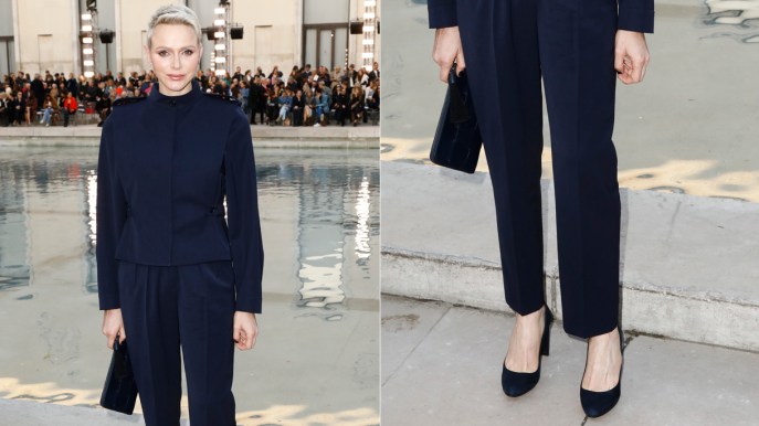 Per non essere da meno, Charlene ha voluto essere presente alla Paris Fashion Week, dove si è presentata con un tailleur blu navy composto da una giacca ispirata alle divise militari con spalline pronunciate, pettorina, collo alla coreana e pantaloni con pence, lunghi fino alle caviglie, naturalmente di Akris come pure la clutch formata da tanti trapezi. Mentre per slanciare la figura, la Principessa opta per delle décolletée dal tacco largo. I capelli biondi con ciuffo corto tirato indietro fanno assomigliare la moglie di Alberto alla Brigitte Nielsen degli anni Ottanta.