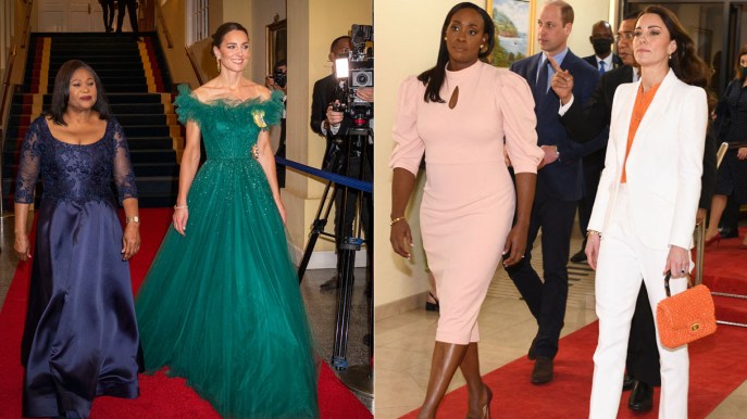 Ma come detto, la Duchessa di Cambridge ha lasciato senza fiato anche con la sua mise da giorno. Per la sua vista all’ufficio del Presidente del consiglio giamaicano e per il suo primo discorso caraibico, Kate ha indossato un tailleur bianco, giacca e pantaloni, di Alexander McQueen, l’altro brand da lei preferito. Costo? 1.945 sterline (2.335 euro circa). Lady Middleton ha abbinato il completo a una camicia arancio, di Ridley London, in seta con piccolo fiocco intorno al collo, una borsa arancio in rafia, di Willow Hilson Vintage e delle décolletée bianche con tacco stiletto di Jimmy Choo. Semplicemente perfetta.