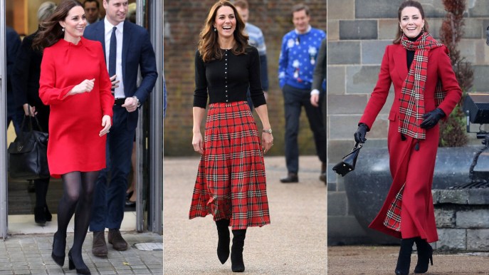 Sotto il cappotto si intravede una maxi gonna in tartan che probabilmente ha già indossato qualche anno fa, sempre a dicembre, abbinandola con i suoi stivali neri in suede, a punta e dal tacco stiletto. Come gioielli, Kate ha scelto un paio di orecchini di perle e un bracciale rigido. Da notare anche un nuovo colore. I capelli sembrano leggermente più biondi del solito e pettinati con grandi boccoli.