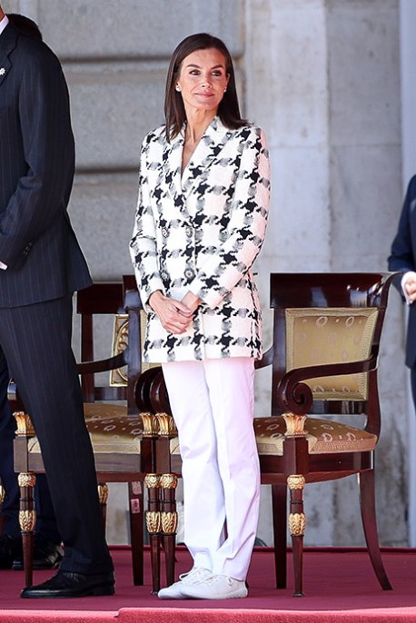 Infine, per celebrare la festa nazionale della polizia, Donna Letizia ha indossato una giacca pied de poule, bianca e nera, firmata Uterqüe, sotto la quale apparentemente non c’è nulla, abbinata a un paio di pantaloni bianchi e le solite stringate.