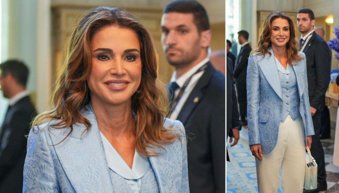 Rania di Giordania, infatti, ha selezionato, per l’occasione, un blazer azzurro polvere, tenuto aperto, con ricami damascati in tinta, abbinato a un gilet della stessa stoffa, che presentava una linea di bottoni sul davanti e un colletto in raso.